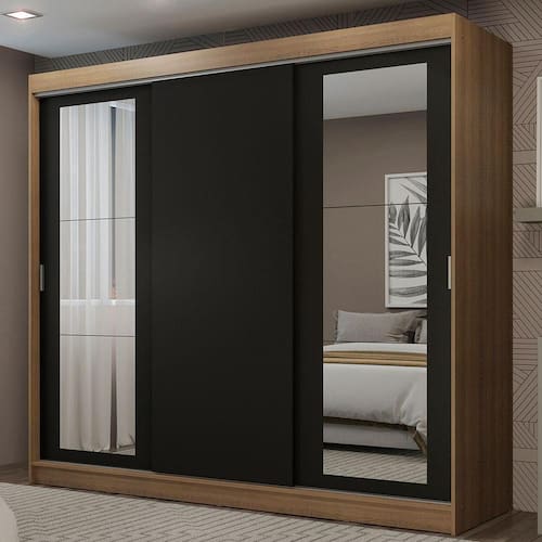 O Guarda-Roupa Kansas da Madesa possui três portas de correr com deslizamento suave, trilhos em alumínio para maior resistência e dois puxadores externos. Duas das portas contam com o diferencial dos espelhos, que são bastante práticos.