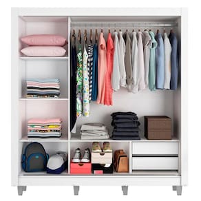 Total aproveitamento interno levando em conta o uso de duas pessoas. São duas gavetas internas com corrediça metálica, muitos nichos que facilitam a organização de roupas, calçados e acessórios. O tubo cabideiro é muito resistente e possui espaço para roupas longas.