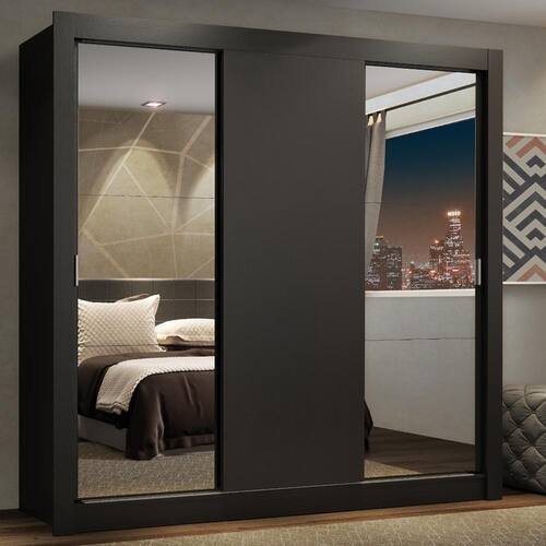 Itens inclusos: - Três (3) prateleiras totalizando quatro (4) nichos - Quatro (4) gavetas internas brancas - Um (1) cabideiro grande - Três (3) portas de correr sendo uma (1) de madeira e duas (2) com espelhos e puxadores em PVC