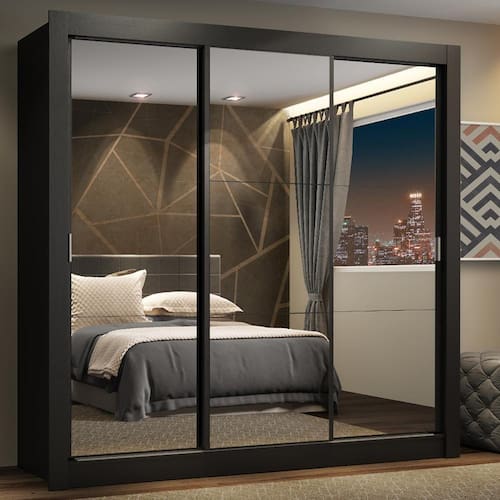 Itens inclusos: - Três (3) prateleiras totalizando quatro (4) nichos - Quatro (4) gavetas internas - Um (1) cabideiro grande - Três (3) portas de correr com espelhos e dois (2) puxadores em PVC