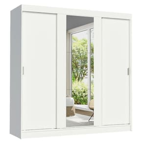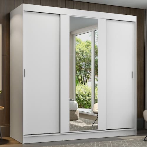 São três portas de correr com trilhos em alumínio e deslizamento suave, que otimizam o espaço do quarto, sem atrapalhar no momento da abertura. Além disso, a porta central conta com espelhos que ampliam o ambiente e são muito práticos no uso diário.