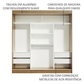 Itens inclusos: - Oito (8) nichos internos - Quatro (4) gavetas internas - Três (3) cabideiros - Três (3) portas de correr, sendo duas (2) de madeira com puxadores em PVC e uma (1) com espelhos