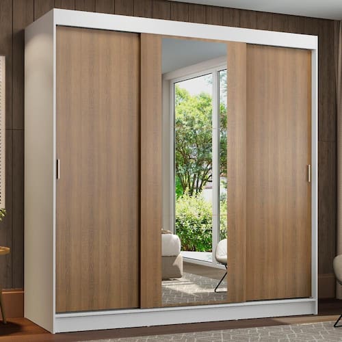 Itens inclusos: - Oito (8) nichos internos - Quatro (4) gavetas internas - Três (3) cabideiros - Três (3) portas de correr, sendo duas (2) de madeira com puxadores em PVC e uma (1) com espelhos
