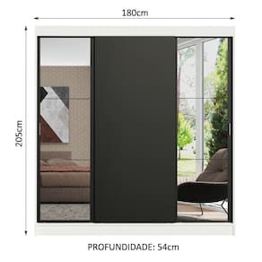 Medidas totais do guarda-roupa: 205 cm de altura x 180 cm de largura x 54 cm de profundidade.