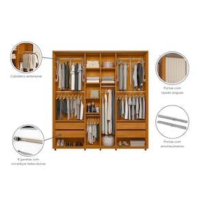 Seu interior oferece espaço otimizado com 4 gavetas internas com corrediças telescópicas que garantem abertura total e mais conforto no uso. Além disso, conta com 8 prateleiras internas bem distribuídas para acomodar roupas, sapatos e acessórios com facilidade.