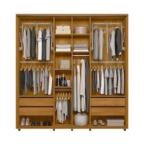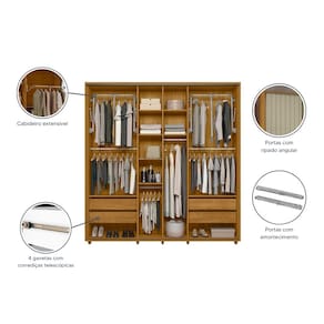 Seu interior oferece espaço otimizado com 4 gavetas internas com corrediças telescópicas que garantem abertura total e mais conforto no uso. Além disso, conta com 8 prateleiras internas bem distribuídas para acomodar roupas, sapatos e acessórios com facilidade.
