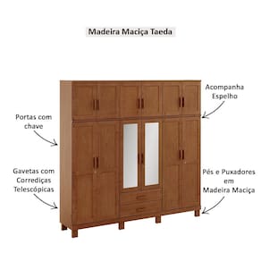 Características: Estrutura em Madeira Maciça Pinus Taeda de reflorestamento Prateleiras e divisórias internas em MDF de 12 mm Pintura Semi-brilho 12 Portas com dobradiças metálicas 02 Gavetas com corrediças telescópica Pés, puxadores, estrutura das portas e cabideiro em madeira Maleiro na parte superior (Montagem Bipartida) Possui espelhos Amplo espaço para armazenamento Peso máximo suportado pelas Prateleiras 10kg distribuídos Peso máximo suportado pelas Gavetas 05kg distribuídos