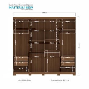 Guarda Roupa Casal Master New 8.4 8 Portas com Espelho e Pés - Santos Andirá O Guarda-Roupa Master Vip New 8.4 é um espaçoso móvel para casal, projetado para oferecer amplo espaço interno. Ele possui uma divisão interna que atende às necessidades de ambos, com áreas designadas para Ele e para Ela. Com quatro grandes gavetas deslizantes, equipadas com corrediças telescópicas para um movimento suave, e dez prateleiras espaçosas para organizar roupas dobradas, acessórios, calçados e itens de decoração. Além disso, conta com quatro cabideiros/calceiros em alumínio para pendurar roupas de forma organizada. Seu design moderno inclui puxadores em MDF revestido, conferindo um toque charmoso e elegante. Este guarda-roupa é a escolha ideal para decorar o quarto do casal com praticidade e qualidade.