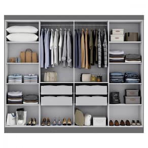 Seu layout interno permite melhor organizacao de roupas longas, dobradas e acessorios. As gavetas com corredicas telescopicas proporcionam abertura suave e maior vida util, enquanto os varoes e calceiro em madeira garantem firmeza e sofisticacao.