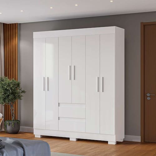 que tal o guarda-roupa maya? com o guarda-roupa maya você leva o aliado perfeito para seu dormitório completo e organizado. além de ter 6 portas e 2 gavetas para te ajudar na organização de itens do dia a dia, o móvel traz um visual sóbrio e atemporal, destacando a coloração elegante e os puxadores alongados em mdf. ah, notou que o espaço interno é na cor linho? um grande diferencial para dar aquele toque extra de charme ao seu quarto dos sonhos ;) Marca: Modern