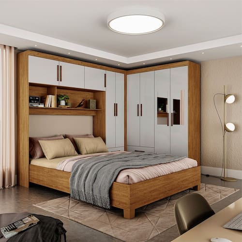 O Guarda Roupa Casal Modulado 5 Portas Hercules 4 Portas, com espelho é ideal para otimizar o espaço do ambiente e deixar tudo organizado. Possui Maleiros, 2 nichos externos, 3 prateleiras, 9 portas, 4 gavetas com corrediças metálicas. Possui pintura UV, que oferece ao produto resistência e durabilidade. A Cama Casal com 1,93 de comprimento e 1,44m de largura é a melhor opção para trazer conforto e elegância ao seu quarto. Produzida em MDP, com estrado de madeira reflorestada e pés de PVC garante durabilidade e resistência ao móvel. Acabamento resistente com impressão UV e verniz de alta duração. Ideal para colchões de 1380mm. Não acompanha o colchão.