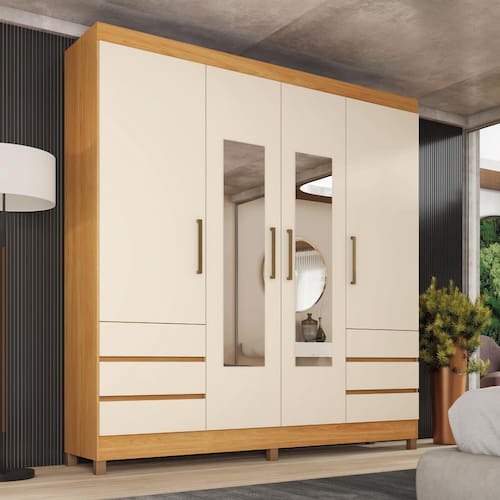 Para maior funcionalidade, o Guarda-Roupa Mônaco já inclui espelhos nas portas, ampliando o ambiente e trazendo conveniência à sua rotina. Sua base é sustentada por pés em PVC, que elevam o móvel e o protegem contra a umidade do piso, assegurando uma durabilidade superior e preservando a integridade da estrutura.