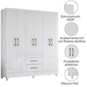 Guarda-roupa Casal Panamá, compacto, funcional e com design moderno. Estrutura em MDP (15/12 mm) e acabamento em pintura UV. Composto por portas com dobradiças metálicas, cabideiro interno (MDP revestido), prateleiras internas e gavetas com corrediças metálicas. Produto com dupla opção de montagem: pés em PVC ou sapatas plásticas (2mm), conforme preferência do cliente. Este produto será entregue em 02 volumes.