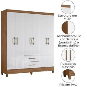 Guarda-roupa Casal Panamá, compacto, funcional e com design moderno. Estrutura em MDP (15/12 mm) e acabamento em pintura UV. Composto por portas com dobradiças metálicas, cabideiro interno (MDP revestido), prateleiras internas e gavetas com corrediças metálicas. Produto com dupla opção de montagem: pés em PVC ou sapatas plásticas (2mm), conforme preferência do cliente. Este produto será entregue em 02 volumes.