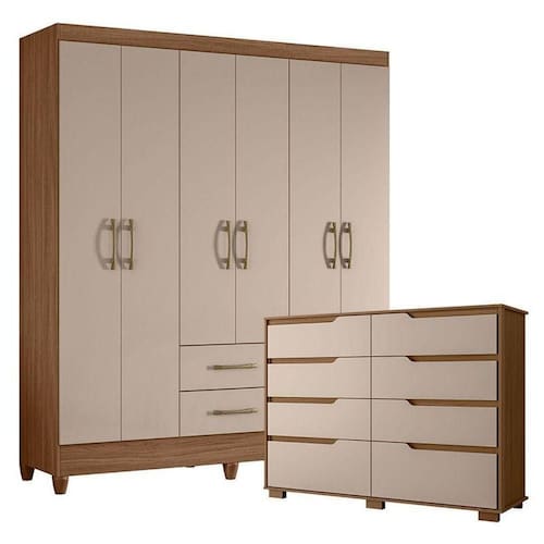 Organize seu quarto com elegância e o melhor custo beneficio do mercado. Apresentamos o Guarda Roupa Casal Panamá e Cômoda Georgia fabricados pela Moval. Guarda Roupa com 06 portas e 02 gavetas com corrediças metálicas, espaço para roupas longas, puxadores na cor bronze, cabideiro para melhor organização interna e pés em PVC. A cômoda possui 08 gavetas com corrediças telescópicas, puxadores usinados, pés em PVC e um design moderno que combina com qualquer decoração. Fabricado com materiais de alta qualidade que garante resistência e durabilidade ao produto. Confira mais detalhes e aproveite!