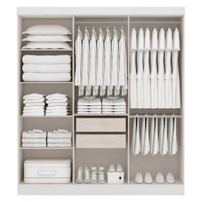 Altura: 200 cm Largura: 180 cm Profundidade: 50 cm Estrutura em MDP de 12 e 15mm Corrediças metálicas; Varões em madeira; Puxadores ABS bronze; Dobradiça de Metal Suporte de peso prateleira 8kg gaveta 3kg Pintura/Acabamento: UV alto brilho Garantia 03 meses