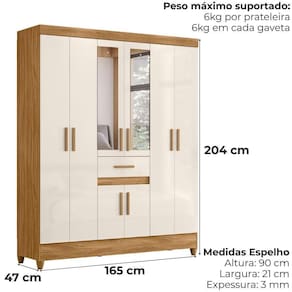 Projetado para atender às necessidades do dia a dia, o Guarda-Roupa Casal Portugal oferece espaço e modernidade. Estrutura em MDP (15/ 12 mm) e acabamento em pintura UV. Composto por portas com dobradiças metálicas (sendo 2 com espelho), cabideiro interno (alumínio), prateleiras e gavetas com corrediças metálicas. Produto com dupla opção de montagem: pés em PVC ou sapatas plásticas (2 mm) conforme preferência do cliente. Este produto será entregue em 03 volumes.