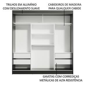 Possui também quatro gavetas espaçosas, dois cabideiros com espaço para roupas longas e um cabideiro para roupas mais curtas. Tem lugar pra tudo que um casal precisa: malas, calçados, travesseiros, colchas e muito mais!