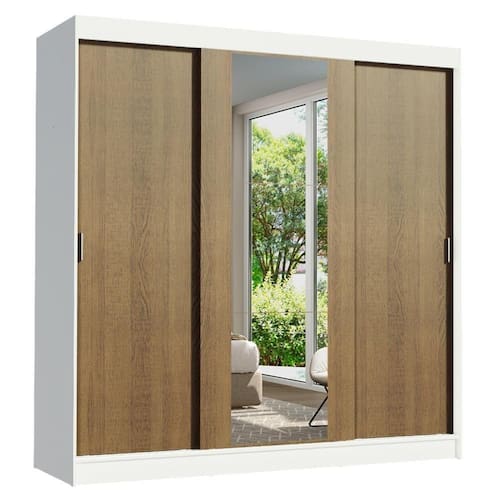 São três portas de correr com trilhos em alumínio e deslizamento suave, que otimizam o espaço do quarto, sem atrapalhar no momento da abertura. Além disso, a porta central conta com espelhos que ampliam o ambiente e são muito práticos no uso diário.