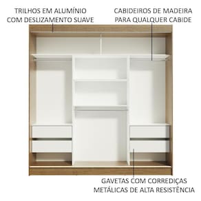 São três portas de correr com trilhos em alumínio e deslizamento suave, que otimizam o espaço do quarto, sem atrapalhar no momento da abertura. Possui também quatro gavetas espaçosas, dois cabideiros com espaço para roupas longas e um cabideiro para roupas mais curtas.
