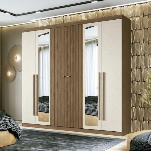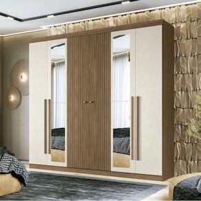O guarda-roupa Buriti 06 portas com espelhos é um guarda-roupa de casal de ótima qualidade, além do design diferenciado e atemporal. São 6 portas, sendo 02 delas em MDF e com detalhe usinado ripado e puxadores pontuais em ABS para abertura. As demais portas em MDP seguem com puxadores em MDF revestido em formato grande. Possui 07 amplas prateleiras com muito espaço para guardar os pertences, 03 cabideiros oblongos em alumínio de excelente qualidade para pendurar as roupas, 04 gavetas com corrediças telescópicas que suportam muito mais peso, compartimento para guardar pertences de valor. O acabamento é em textura Reverse semi-fosco, suave ao toque, e que facilita a limpeza. Seu processo fabril é certificado na Iso 9001 excelência na qualidade e Iso 14001 no cuidado com o meio ambiente. Acabamento da Prateleira: Pintura Escala de Brilho da Prateleira: Semi-Fosco Possui Cabideiros: Sim Acabamento da Gaveta: Pintura Escala de Brilho da Gaveta: Semi-Fosco Material do Puxador da Gaveta: MDP Possui Organizador de Gaveta: Não Acabamento da Porta: Pintura Escala de Brilho da Porta: Semi-Fosco Material do Puxador da Porta: MDF Altura do Espelho: 95 cm Altura dos Pés: cm Ambiente Principal: Quarto codigo_ean: 7909903452349 Complexidade da Montagem: Alta: deve ser montado por um montador especializado Cor: Jatobá/Areia Cor do Produto: Jatobá/Areia Cor Flex: Sim Cor Interna: Jatobá Escala de Brilho: Semi-Fosco Espessura do Espelho: 3 mm Fita Integrada: Sim Formato do Espelho: Retangular Gaveta com Chave: Não Informações Complementares: Possui 04 espelhos Itens Inclusos: 1 Guarda Roupa, Kit Ferragens e Manual de Montagem Largura do Espelho: 25 cm Linha ou Coleção: Guarda-roupas Manual de Especificação Técnica: https://product-hub-prd.madeiramadeira.com.br/869303/documents/241b9f75-b2b2-458f-9312-cd1899d1da521522797fixacaodeespelho.pdf Manual de Montagem e Instalação: https://product-hub-prd.madeiramadeira.com.br/869303/documents/33f77611-cc6b-4239-9b7b-a7a6f0fadf741420792949315grburiti06pts.pdf Material da Gaveta: MDP Material da Porta: MDF/MDP Material da Prateleira: MDP Material Principal: MDP modular: Não Montagem Flex: Sim Necessita Montagem: Sim Origem do Produto: Nacional Peso: 151,8 kg Peso Máximo por Gaveta: 3 kg Peso Máximo por Prateleira: 3 kg Possui Calceiros: 01 Possui Espaço para Vestidos Longos: Não Possui Espelho: Sim Possui Espelho Interno: Não Possui Ganchos: Não Possui iluminação: Não Possui Nichos: Não Possui Painel de TV: Não Possui Pés: Não Possui Portas: Sim Possui Prateleiras: Sim Possui Sapateira: Não Produto Montado: Sim Quantidade de Espelho: 04 Espelhos com Tamanhos Iguais Quantidade de Gavetas: 04 Gavetas Quantidade de Prateleiras: 07 Prateleiras Recomendações de Uso, Manutenção e Limpeza: Pano Umedecido e Flanela Sistema de Montagem: Parafusos e Cavilhas Tipo de Corrediça da Gaveta: Metálica Telescópica Tipo de Dobradiça/Corrediça da Porta: Metálica Tipo de Fixação do Espelho: Fita Dupla Face Tipo de Gaveta: Interna Tipo de Guarda-Roupa: Casal Tipo de Puxador da Gaveta: Não Possui Tipo de Puxador da Porta: Externo Ean: 7909903452349