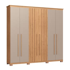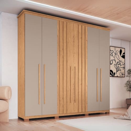 Caracter?sticas: 3 Cabideiros em alum?nio 3 Gavetas com corredi?as telesc?picas de extra??o total para melhor aproveitamento interno 6 Portas sendo duas com detalhe ripado 7 Prateleiras internas Estrutura em MDP 12,15mm Fundos MDF 3mm Portas com Puxador em MDF Possui p?s