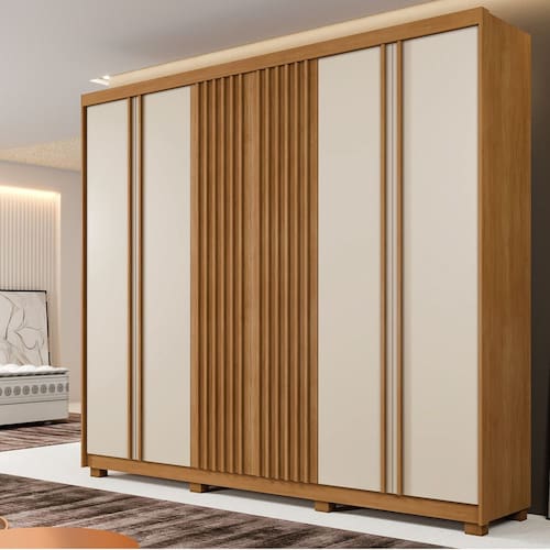 Guarda Roupa Casal Ripado 6 Portas com Pés Montral Benetil. O Roupeiro Montreal é a escolha ideal para quem busca design sofisticado, excelente capacidade interna e durabilidade. Produzido em chapa de MDP 15 mm, garante estrutura robusta e longa vida útil. Design moderno com portas ripadas amadeiradas, alinhando beleza e funcionalidade ao ambiente. Conta com 6 portas, 9 prateleiras e 6 gavetas espaçosas com corrediças telescópicas, oferecendo organização e suavidade no uso. Possui cabideiro em alumínio, espaço para roupas longas e pés inclusos, facilitando a limpeza e estabilidade do móvel.