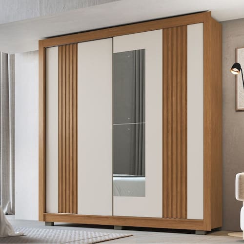 O Guarda Roupa Casal Ripado Tokyo Faimec, ideal para quem busca elegância e funcionalidade. Conta com 2 portas de correr, sendo uma com espelho, design ripado sofisticado e estrutura em MDP de 12 e 15mm. Internamente, oferece amplo espaço com 1 cabideiro em alumínio, 2 gavetas com corrediças telescópicas, 6 nichos e 2 prateleiras, garantindo organização. Além disso, possui pés, proporcionando mais estabilidade e um toque moderno ao ambiente.
