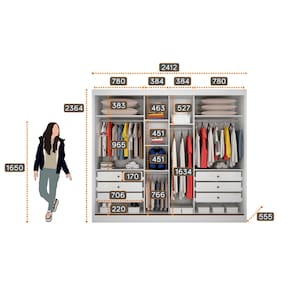 Particularidades do guarda-roupa: Características: - 100% MDF; - Colunado em 25mm; - Espelho com película de segurança;; - 6 Gavetas internas com puxadores; - Corrediças telescópicas; - Trilho inferior em alumínio e roldanas com amortecedores; - Roldana superior com guia zero e freio; - Fundo inteiriço; - Cabideiros em alumínio; - Duas opções de interno;