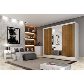 Particularidades do guarda-roupa: Características: - 100% MDF; - Colunado em 25mm; - Espelho com película de segurança;; - 6 Gavetas internas com puxadores; - Corrediças telescópicas; - Trilho inferior em alumínio e roldanas com amortecedores; - Roldana superior com guia zero e freio; - Fundo inteiriço; - Cabideiros em alumínio; - Duas opções de interno;