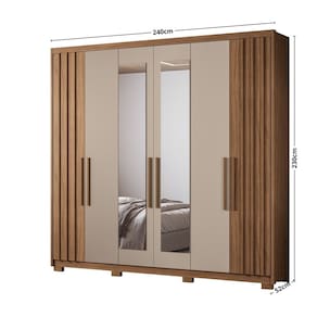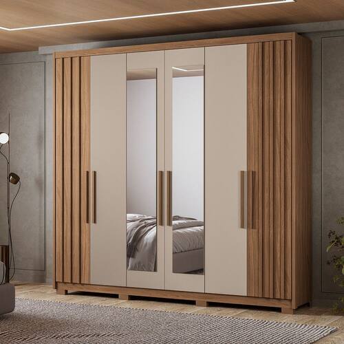 Características: 3 Cabideiros em alumínio 4 Gavetas com corrediças telescópicas 4 Nichos 6 Portas sendo duas com detalhe ripado 4 Prateleiras Estrutura em MDP Moldura laterais em 25 mm Possui espelhos e pés Puxadores em MDF