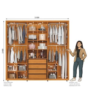 Características: 4 Espelhos 1139x329mm 4 Gavetas com corrediças telescópicas 8 Nichos 6 Portas Cabideiros retrateis em alumínio com pistão a gás Dobradiças de 35mm com sistema de amortecimento Estrutura 100 MDF 15mm e 25mm Fixação com minifix e parafusos Pés em poliestireno Peso total suportado 118kg Puxadores em MDF Revestimento em pintura UV