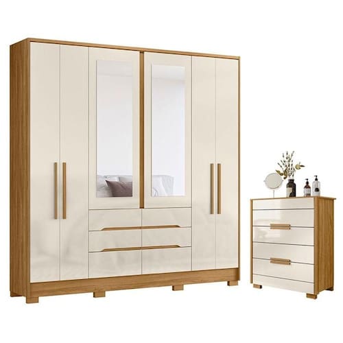Começou a montar seu quarto? Então apresentamos para você este belo conjunto composto pelo guarda roupa da linha San Francisco e a cômoda da linha Dhara. O guarda roupa conta com seis portas, sendo as duas centrais com espelho. Com seis gavetas proporciona um espaço extra para acomodar suas roupas. Completando o conjunto, a cômoda conta com quatro gavetas. Assim como o guarda roupa, possui puxadores em MDF, corrediças telescópicas e pés em PVC, proporcionando mais estabilidade e facilitando na hora da limpeza. Fabricados pela Moval, são desenvolvidos em MDP aliando beleza, funcionalidade e resistência. Perfeito para compor seu quarto com muito estilo. Aproveite e garanta já o seu!
