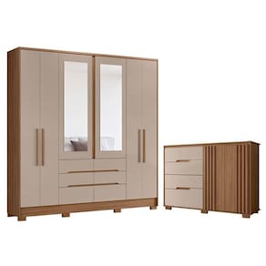 Está montando seu quarto? Apresentamos para você este belo conjunto composto pelo guarda roupa da linha San Francisco e a cômoda da linha Texas. O guarda roupa conta com um ótimo espaço interno possuindo seis portas, sendo as duas centrais com espelho. Os puxadores em MDF dão um acabamento elegante. Internamente conta com seis gavetas, perfeito para manter a organização. Complementando o conjunto, a cômoda conta com duas portas possuindo detalhes ripados em MDF e quatro gavetas. Assim como o guarda roupa, conta com corrediças telescópicas, detalhes usinados nas gavetas e pés em PVC, facilitando na limpeza e proporcionando estabilidade. Fabricados pela Moval, são desenvolvidos em MDP de alta qualidade, sendo ideal para quem busca compor o quarto com praticidade, organização e sem abrir mão do estilo. Aproveite e garanta já o seu!