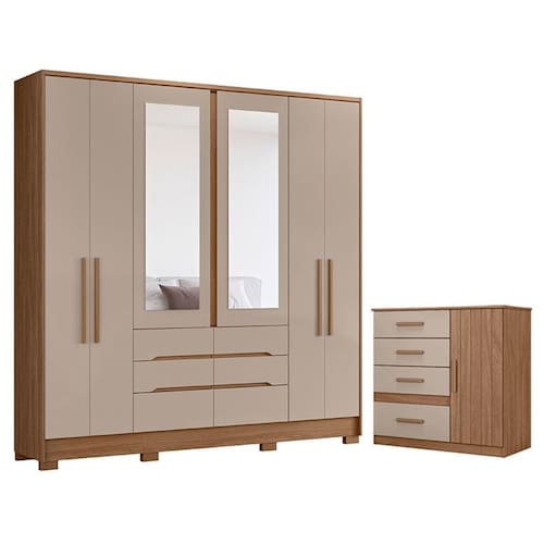 Está procurando móveis para seu quarto? Apresentamos para você este belo conjunto composto pelo guarda roupa da linha San Francisco e a cômoda da linha Vênus. Com design moderno e espaçoso, o guarda roupa possui seis portas, sendo as duas centrais com espelho. Contando com seis gavetas equipadas com corrediças telescópicas, além de pés em PVC. Completando o conjunto, a cômoda possui uma porta com detalhe frisado em MDF, além de quatro gavetas com corrediças metálicas, ideal para organização de suas roupas. Assim como o guarda roupa, possui puxadores em MDF garantindo um acabamento refinado. Fabricados pela Moval, são desenvolvidos em MDP de qualidade, sendo a combinação de praticidade, durabilidade e bom gosto para compor seu quarto. Aproveite e garanta já o seu!