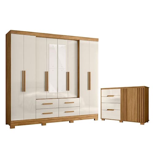 Organize seu quarto com elegância e o melhor custo benefício do mercado. Apresentamos o Guarda Roupa Casal San Lorenzo e Cômoda Texas fabricados pela Moval. Guarda Roupa com 08 portas, portas laterais avançadas, 04 gavetas com corrediças telescópicas, puxadores na cor bronze, cabideiro e calceiros em alumínio para melhor organização interna e pés em PVC. A cômoda possui 04 gavetas com corrediças telescópicas, puxadores usinados, dobradiças 35mm com amortecedor, portas com detalhes ripados, pés em PVC e um design moderno que combina com qualquer decoração. Fabricado com materiais de alta qualidade que garante resistência e durabilidade ao produto. Confira mais detalhes e aproveite!