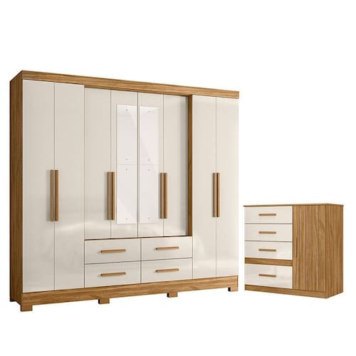 Organize seu quarto com elegância e o melhor custo benefício do mercado. Apresentamos o Guarda Roupa Casal San Lorenzo e Cômoda Lisboa fabricados pela Moval. Guarda Roupa com 08 portas, portas laterais avançadas, 04 gavetas com corrediças telescópicas, puxadores na cor bronze, cabideiro e calceiros em alumínio para melhor organização interna e pés em PVC. A cômoda possui 05 gavetas com corrediças metálicas, puxadores em MDF, 01 porta, painel com espelho, pés em PVC e um design moderno que combina com qualquer decoração. Fabricado com materiais de alta qualidade que garante resistência e durabilidade ao produto. Confira mais detalhes e aproveite!