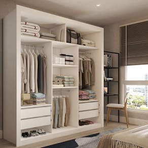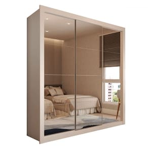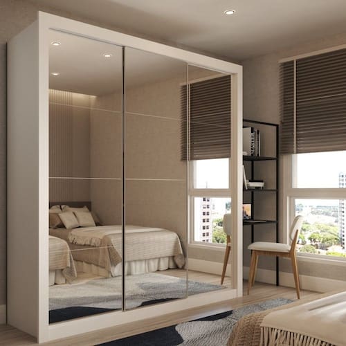 O(a) Guarda-Roupa Casal Santos 3 Portas de Correr 4 Gavetas Espelhado Branco - Loja é produzido em MDP na escala de brilho Brilho, e possui um grau de dificuldade de montagem: Médio.