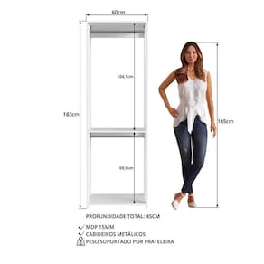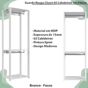 • Modelo: Guarda Roupa Closet 02 Cabideiros 183X60cm PRODDY • Material: MDP 15 mm • Acabamento: Fosco • Suporte: Até 7kg por Prateleira • Sistema de Montagem: Parafusos e cavilhas