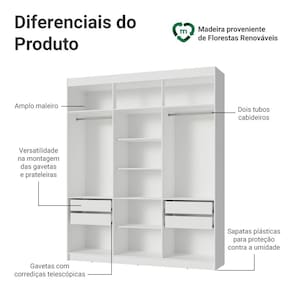 O closet conta com dois cabideiros, várias prateleiras amplas e quatro gavetas espaçosas, garantindo flexibilidade e espaço suficiente para acomodar roupas, calçados e acessórios com facilidade. As gavetas com corrediças telescópicas permitem abertura total, enquanto o amplo maleiro é perfeito para itens maiores. Além disso, você pode ajustar as gavetas e prateleiras para personalizar o interior conforme suas necessidades.