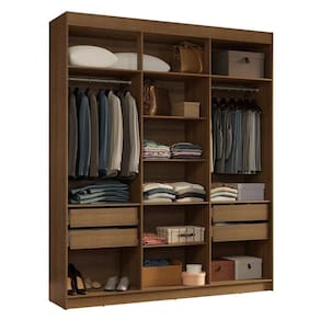 O closet conta com dois cabideiros, várias prateleiras amplas e quatro gavetas espaçosas, garantindo flexibilidade e espaço suficiente para acomodar roupas, calçados e acessórios com facilidade. As gavetas com corrediças telescópicas permitem abertura total, enquanto o amplo maleiro é perfeito para itens maiores. Além disso, você pode ajustar as gavetas e prateleiras para personalizar o interior conforme suas necessidades.
