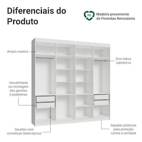 O closet conta com dois cabideiros, várias prateleiras amplas e quatro gavetas espaçosas, garantindo flexibilidade e espaço suficiente para acomodar roupas, calçados e acessórios com facilidade. As gavetas com corrediças telescópicas permitem abertura total, enquanto o amplo maleiro é perfeito para itens maiores. Além disso, você pode ajustar as gavetas e prateleiras para personalizar o interior conforme suas necessidades.