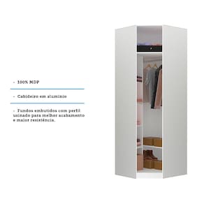 Guarda Roupas sem Portas Modulado Canto Diagonal para Closet com 1 Cabideiro, 1 Maleiro e 5 Prateleiras com 83,80cm de largura. A linha de roupeiros projetados Prime Closet é o sonho de consumo dos projetos de Closets. Produto 100 em MDP 15mm com acabamento impecável e rápida montagem. Possui 1 cabideiro em alumínio, 1 maleiro amplo para objetos ou peças maiores e 5 prateleiras para peças ou objetos menores. Esse produto é muito versátil, podendo ser utilizado em diversos cômodos da sua casa, garantindo a você monta-lo de acordo com suas preferência e necessidade. Aproveite essa oportunidade para transformar seu sonho em realidade.