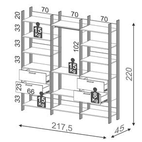 Peso Suportado: 15 Kg por prateleira e 8 Kg por gaveta.
