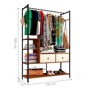 Com design industrial, possui 3 prateleiras e 2 gavetas, que ajudam a manter as roupas arrumadas.