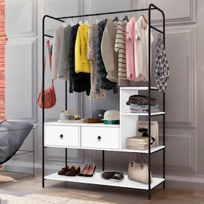 Com design industrial, possui 3 prateleiras e 2 gavetas, que ajudam a manter as roupas arrumadas.