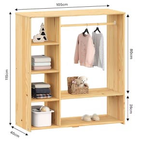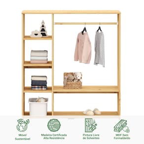 Características Principais:Material: Produzido com madeira maciça finger de qualidade, garantindo durabilidade e resistência. Design Aberto: Sem portas, proporciona fácil acesso às roupas e objetos, incentivando a autonomia das crianças. Cabideiro Integrado: Ideal para pendurar roupas, mantendo-as organizadas e sem amassados. Espaço Amplo: Com várias prateleiras e nichos, oferece espaço suficiente para roupas, brinquedos e acessórios, sendo possível a remoção das prateleiras. Praticidade: Facilita a visualização e o acesso aos itens do dia a dia. Estímulo à Organização: Perfeito para ensinar as crianças a manterem suas roupas e pertences organizados. Versatilidade: Pode ser utilizado tanto em quartos de meninos quanto de meninas, além de se adaptar a diferentes estilos de decoração.