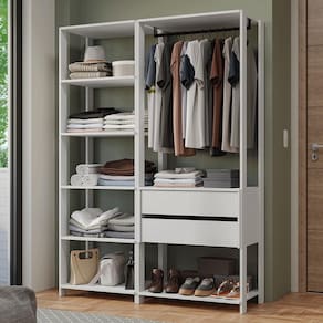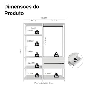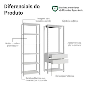 Seu design aberto facilita o acesso às roupas e acessórios no dia a dia. São duas gavetas com corrediças que permitem abertura total, um cabideiro metálico e cinco prateleiras amplas para manter tudo no lugar, com visibilidade e funcionalidade.