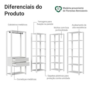 Cada módulo foi projetado para proporcionar um espaço de armazenamento organizado, unindo praticidade e estilo para seu ambiente. Você vai receber três closets abertos de 59 cm de largura, cada um com cinco prateleiras amplas, perfeitos para roupas dobradas e calçados. E um closet aberto de 70 cm de largura, com duas gavetas espaçosas, ideais para itens menores e acessórios, além dos cabideiros.