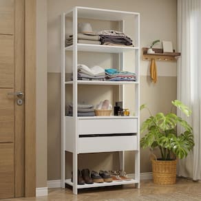- Um Closet aberto com duas gavetas e quatro prateleiras